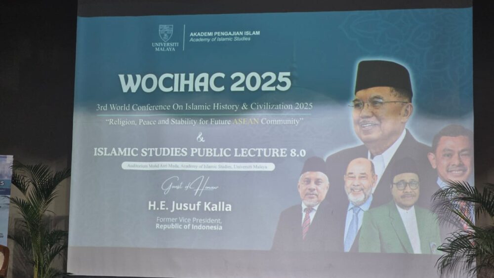 Kuliah umum tersebut disampaikan Jusuf Kalla sebagai keynote speaker dalam agenda World Conference on Islamic History and Civilization 2025 yang mengangkat tema “Religion, Peace, and Stability for Future ASEAN Community”.