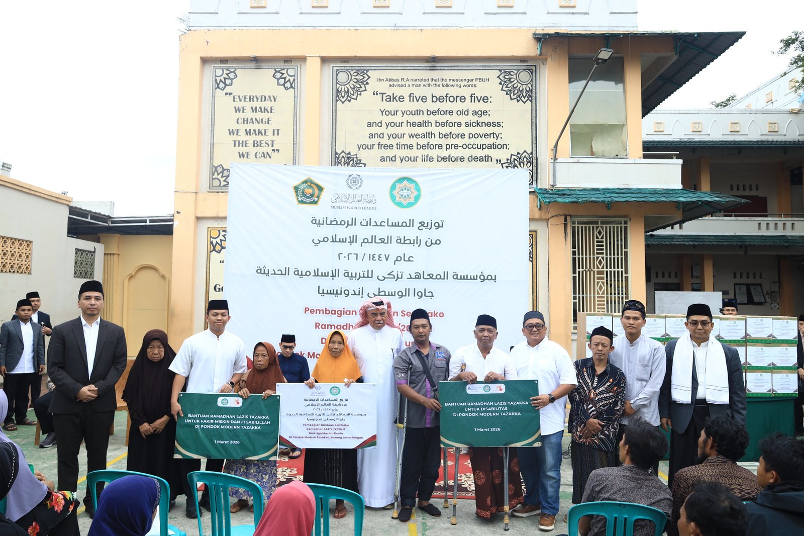 Tasharuf paket sembako tersebut diserahkan pada acara seremonial sebelum pelaksanaan Silaturahim Akbar dan Buka Puasa Ramadhan 1447 H. Selain Pimpinan Pindok Modern Tazakka, K.H. Anang Rikza Masyhadi, M.A., Ph.D. dan K.H. Anizar Masyhadi, M.A., hadir pula Direktur Liga Muslim Dunia Kantor Jakarta, H.E. Ambassador Abdul Rahman Al-Khayyat.