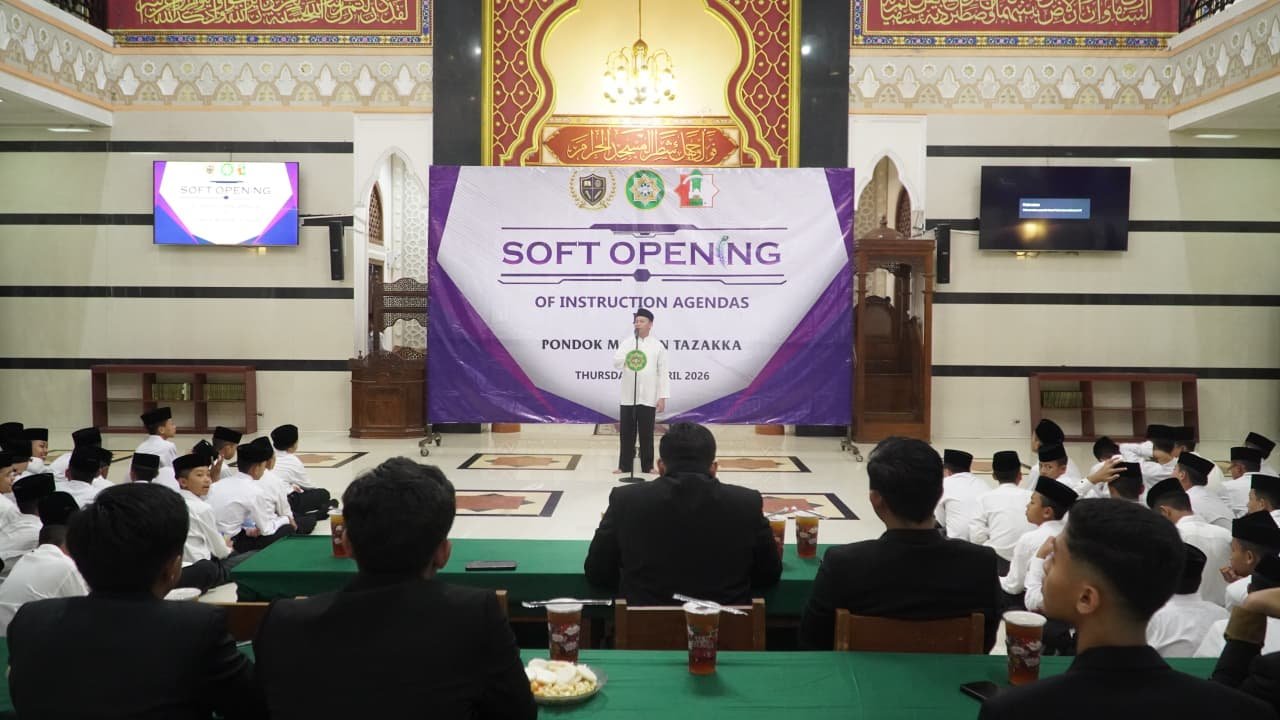 Kamis, 23 April 2026 — Pondok Modern Tazakka menggelar kegiatan Soft Opening Instruction Agenda sebagai langkah awal dalam membangun dan menguatkan lingkungan berbahasa yang aktif, terarah, dan inspiratif di kalangan santri. Kegiatan ini dihadiri oleh Al-Ustadz Hawin Aulia Abdullah, Lc. selaku Kepala Departemen Pengasuhan Santri serta Al-Ustadz Ferry Hidayat, S.Th.I., S.Fil.I., M.A. sebagai Musyrif Pembimbing Bahasa dan Muhadhoroh.dok.