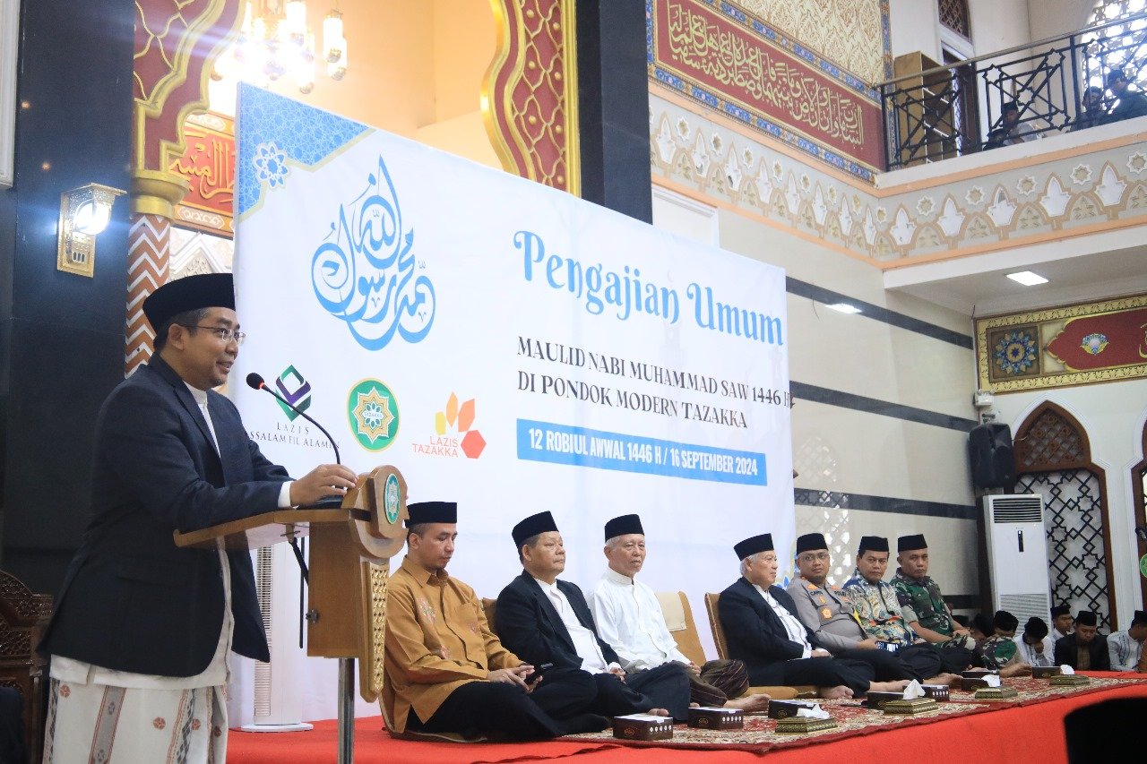 TAZAKKA – Pondok Modern Tazakka menggelar Pengajian Umum dalam rangka memperingati Maulid Nabi Muhammad SAW tahun 1446 H pada Senin (16/9) di Masjid Az-Zaky. Acara yang dimulai pukul 16.00 ini dihadiri oleh sekitar 2000 jamaah, termasuk santri, guru, anshar, wali santri, dan masyarakat sekitar.