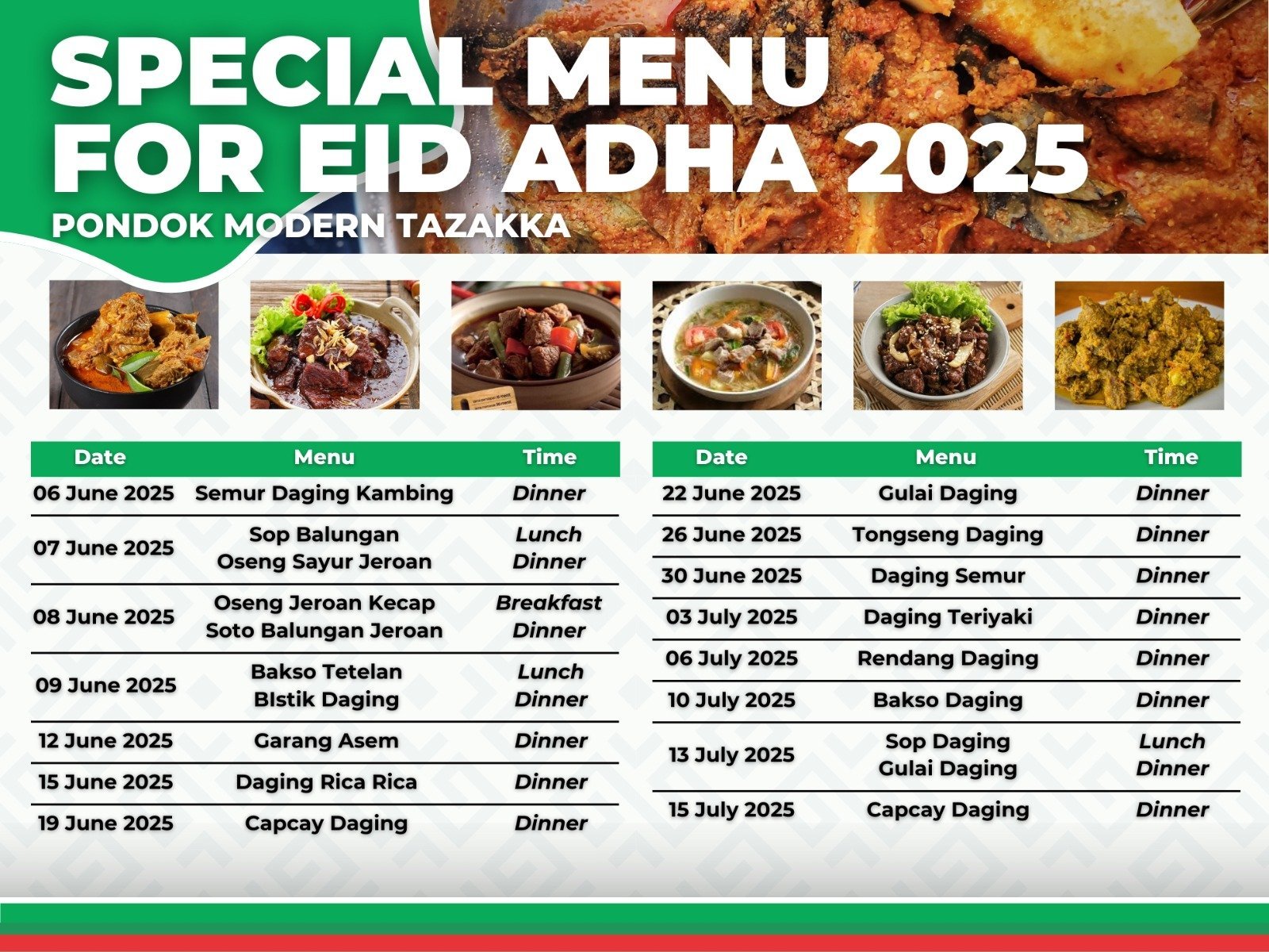Dalam rangka menyambut dan memeriahkan Hari Raya Idul Adha 1446 H, Pondok Modern Tazakka kembali menghadirkan sajian istimewa bagi seluruh santri dan keluarga besar pondok. Bertajuk Special Menu for Eid Adha 2025, OPPM Kementerian Urusan Pangan telah menyiapkan berbagai hidangan berbasis olahan hewan qurban yang disajikan secara bergilir sepanjang bulan Juni dan Juli 2025.