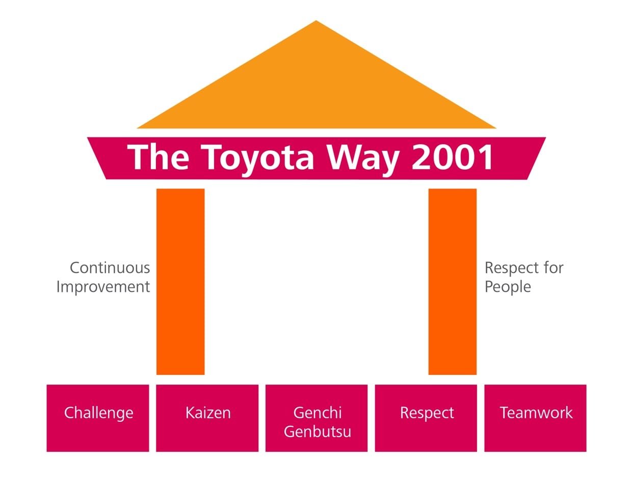 Toyota memiliki The Toyota Way. Sebuah platform perusahaan. Lalu, menjadi sebuah corporate culture, budaya perusahaan. Sehingga, Toyota bukan saja eksis, tapi berkembang dan maju. Sehingga sampai saat ini mobil Toyota beredar di penjuru dunia.